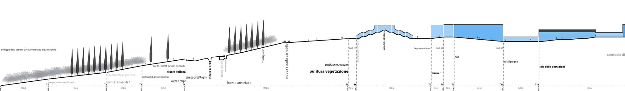 Il progetto ha come obiettivo la costruzione di una costellazione di nodi emozionali capaci di coinvolgere il visitatore in un incontro “drammatico”. La piantumazione di filari di cipressi ricostruisce gli schieramenti degli eserciti contrapposti suggerendo un ipotetico scenario di battaglia. Il percorso espositivo si ramifica in un’area più ampia, mutandone la percezione e risignificandone gli elementi esistenti. Una sequenza di “stanze” posta lungo percorsi che si dipanano sui rilevi carsici e che trovano nel nuovo museo l’elemento nodale di riconnessione. L’applicazione della tattica militare di occupazione e trasformazione delle preesistenze diventa la strategia progettuale utilizzata per il museo. restyling consiste nel racchiudere l’attuale edificio all’interno di un guscio di calcestruzzo così da definire nuove spazi interni in cui i prospetti del museo esistente costituiranno le partizioni. Il percorso delle esposizioni termina all’interno di una torre collegata al museo da una terrazza panoramica.
