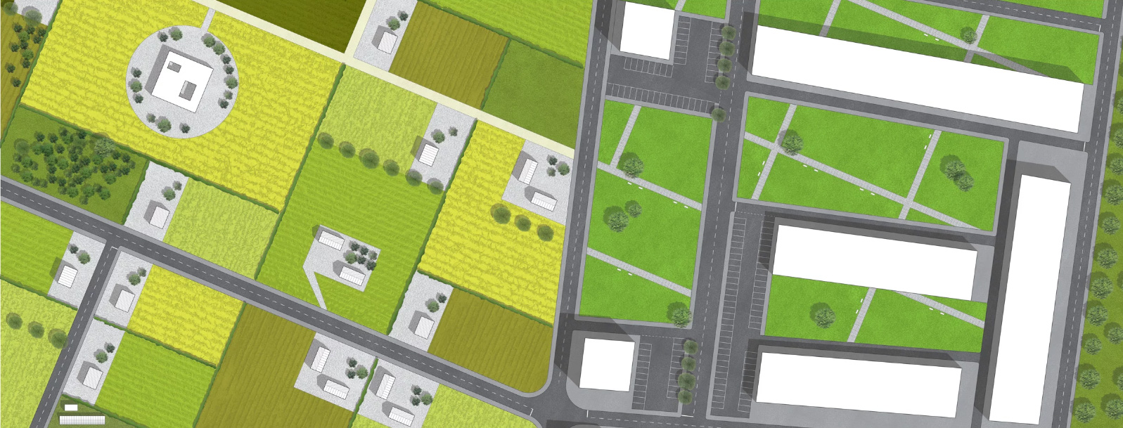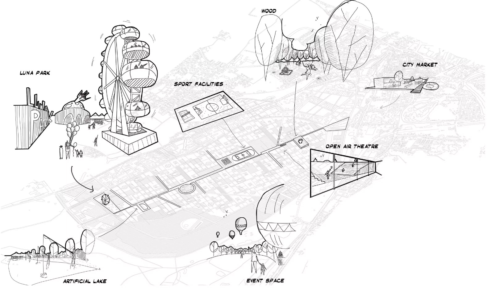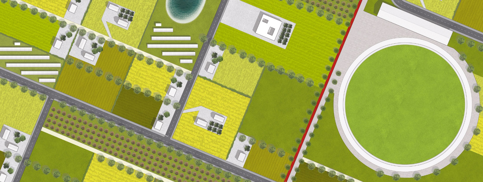 The idea was to build a system which could be able to absorb the necessity of the urban and economic development of the city, through the reuse and the safeguard of a big open space, by its conversion into a fruitful territory. This double vision turned into the definition of perimetral urban system and a rural-residential park in the area of the landing field.