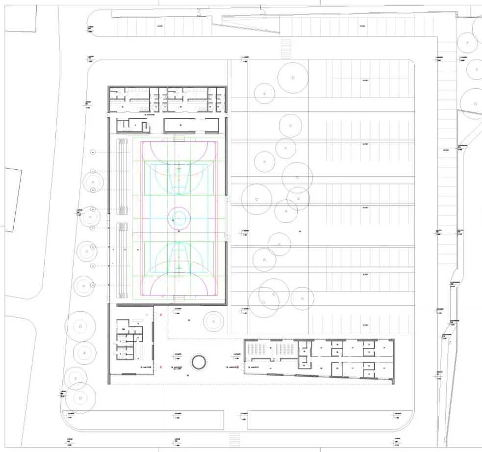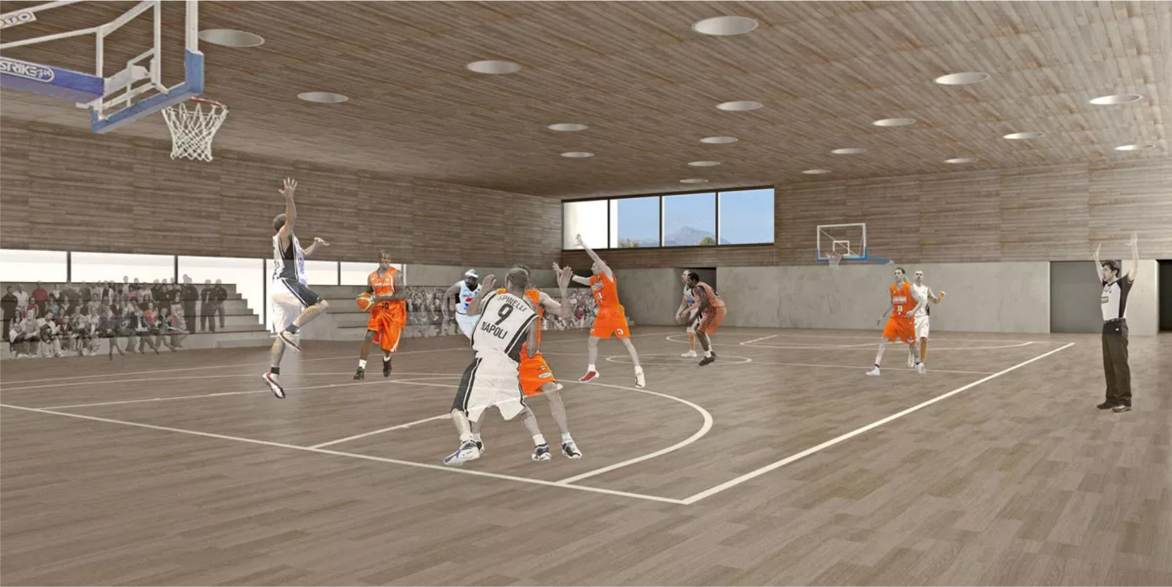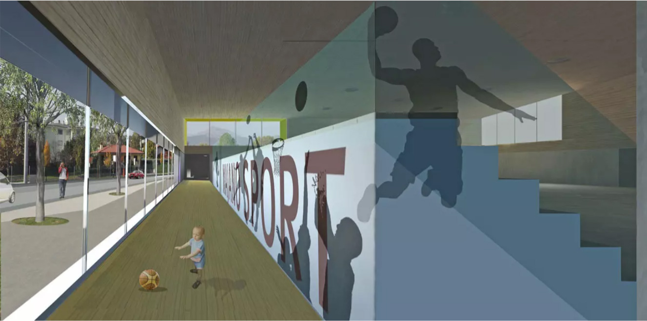 Il prospetto sulla piazza sarà caratterizzato da una copertura-portico sotto cui trovano posto le sale per le associazioni e che introduce a uno spazio definito dalla hall della palestra e dalla parete su cui verrà riposizionato il mosaico del maestro Pittino. Un luogo raccolto dove potranno condensarsi i fruitori della struttura sportiva. La copertura inoltre segna l'inizio del percorso pedonale verso il cuel dal fum che rimarrà visibile grazie allo sviluppo orizzontale dell'edificio delle associazioni che, anzi, permetterà di escludere la viste delle auto ospitate dal parcheggio retrostante.