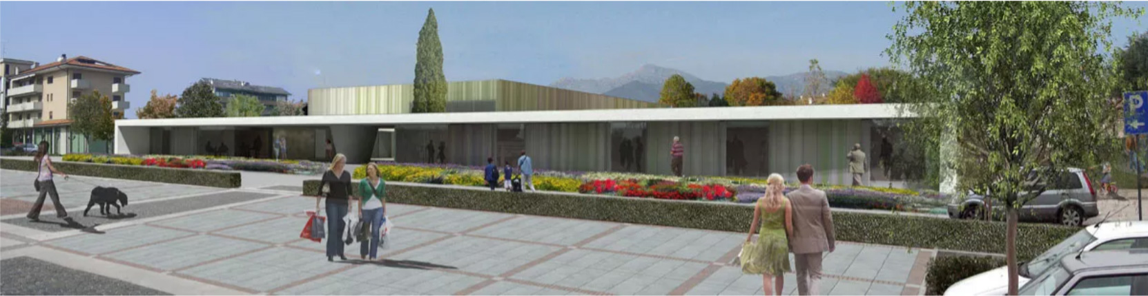 La proposta di progetto prevede un impianto in cui la palestra lungo la via Zorutti e un nuovo fronte sulla piazza Italia, definiscono un spazio urbano con funzioni complesse che possa fungere da testata a un sistema più ampio comprendente la piazza, il parco Cuel dal Fum, gli impianti sportivi e ricreativi all'aperto, le scuole.